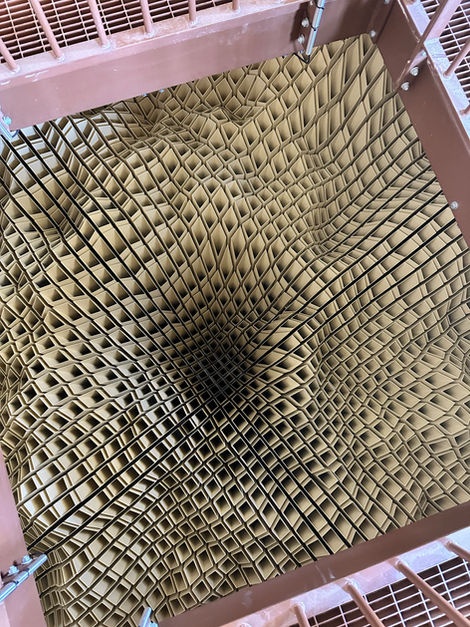 L’installation évoque ainsi un étrange sablier géant, la matière semblant s’écouler vers un espace inconnu.
