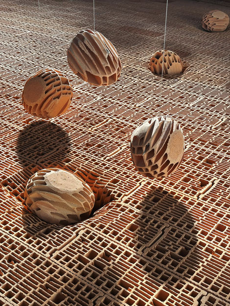 Untitled, Vincent Mauger, 2025, installation, surface area of 100 m², bricks on the floor and elements suspended by cables.